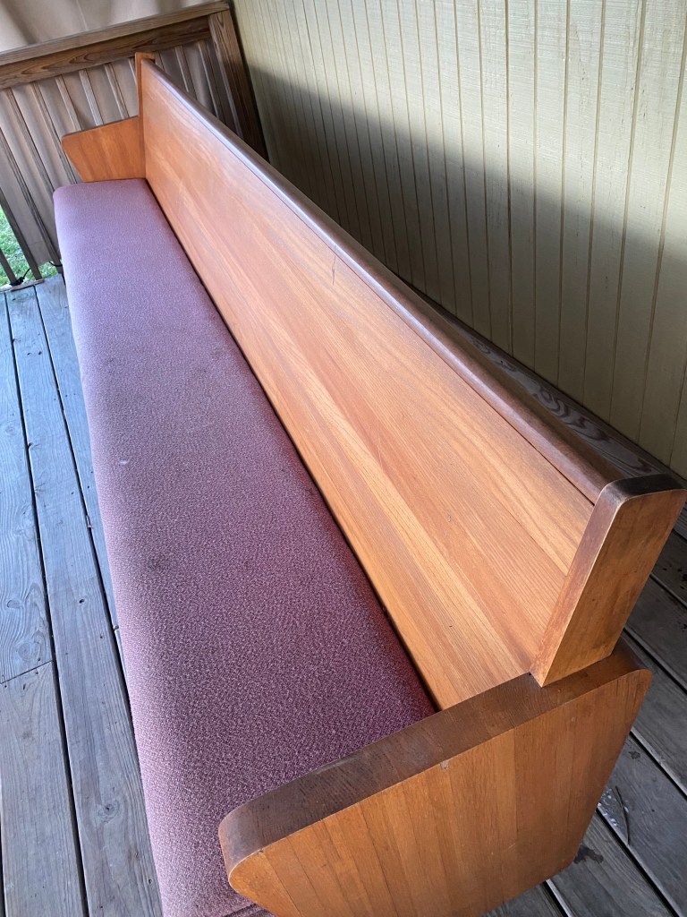 My wife and I were fortune enough to get one of the pews and we placed it on our back deck.  We occasionally sit in it and marvel at God’s beautiful creation.